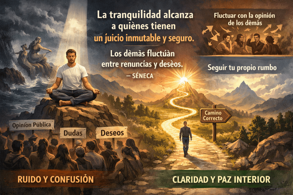 La tranquilidad solo alcanza a quienes se han formado un juicio inmutable y seguro: los demás enseguida desfalleces y luego se recuperan. Fluctúan alternativamente entre renuncias y deseos. ¿ Cuál es la causa de su agitación? Que nada queda claro a los que siguen la más insegura de las normas, la opinión pública..