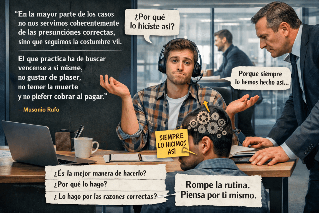 Le preguntan a un empleado: ¿ Por qué lo hiciste así? El responde <Porque siempre lo hemos hecho así>. Esta respuesta frustra a cualquier buen jefe y hace salivar a cualquier emprendedor. El empleado ha dejado de pensar y está operando mecánicamente, a partir del hábito. Es el momento oportuno para que la competencia trastoque el negocio, y es probable que cualquier jefe con sentido común despida a ese trabajador.