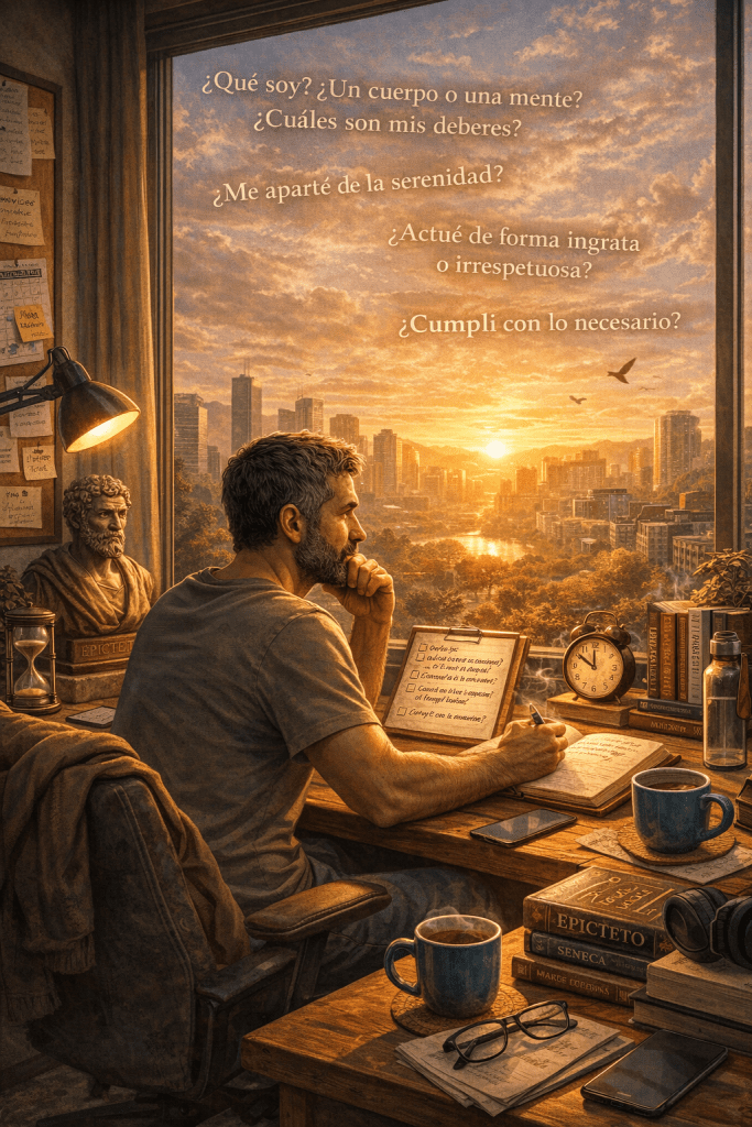 ¿ Qué me falta para la impasibilidad? ¿ Qué me falta para la imperturbabilidad? ¿ Quién soy? ¿ Un simple cuerpo, un heredero o una reputación? Ninguna de esas cosas. Entonces ¿ qué? Un ser racional. ¿Cuáles son mis obligaciones? Repasa todo lo que has hecho. ¿Cuándo me aparté de la serenidad? ¿ Hice algo poco amistoso, insociable o ingrato? ¿Qué no llevé a cabo de lo necesario para esto?