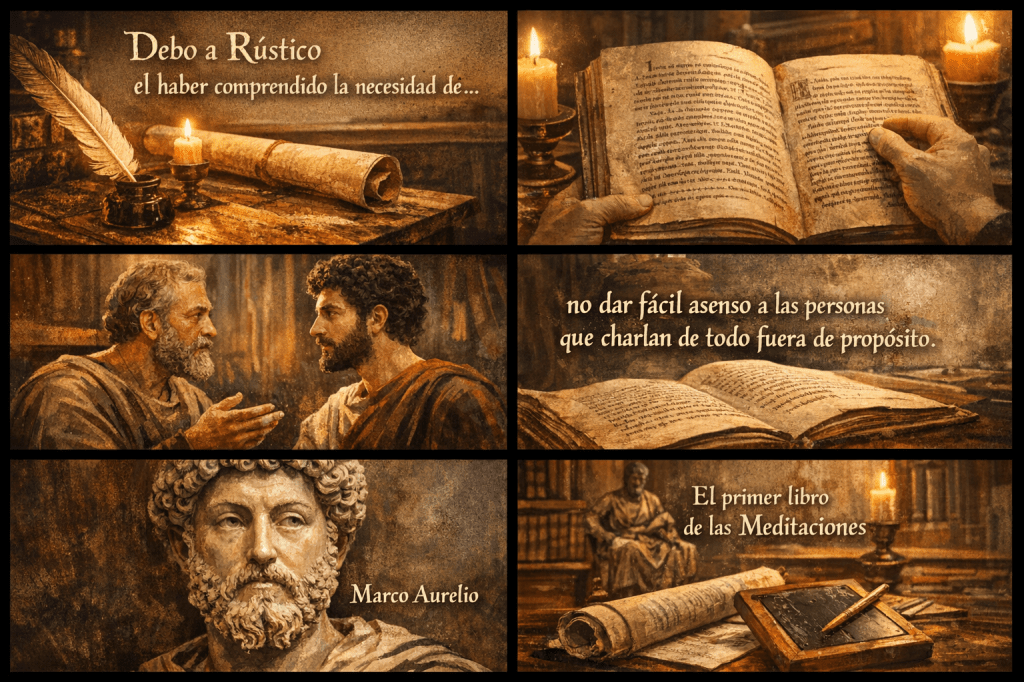 El primer libro de las Meditaciones de Marco Aurelio comienza con un catálogo de gratitud. Agradece, una a una, las principales influencias en su vida. Una de las personas a las que menciona es Junio Rústico, un profesor que inculcó en su alumno el amor por la claridad, la compresión a fondo y el deseo de no detenerse en la superficie cuando se trata de aprender.