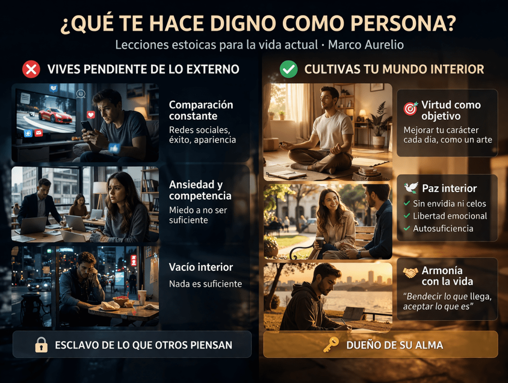 ¿Queda algo entonces, que pueda realizar la dignidad del hombre? Lo único, a mi parecer, es adaptar la conducta de cada uno a la organización interior de su ser, haciendo de esto el único objeto, como si se tratara del estudio de las artes… He aquí, pues, lo que hace al hombre verdaderamente digno de aprecio; si llegas a conseguir esta perfección, los demás objetos te parecerán indiferentes. ¿Acaso podrás luego dar importancia a otras cosas? ¿No serás libre nunca, ni capaz de bastarte a ti mismo, ni estarás exento de perturbación? Sin duda tendrás envidia, celos y sospechas de los que pudieran arrebatarte estos vienes imaginarios; y quizá también tiendas lazos a los que poseen lo que en tanta estima tienes… Si, por el contrario respetas y honras tu alma, estarás siempre contento de ti mismo, en buena inteligencia con los hombres y de acuerdo con los dioses; sí, los bendecirás por todo lo que te envían y por todo lo que te han destinado.