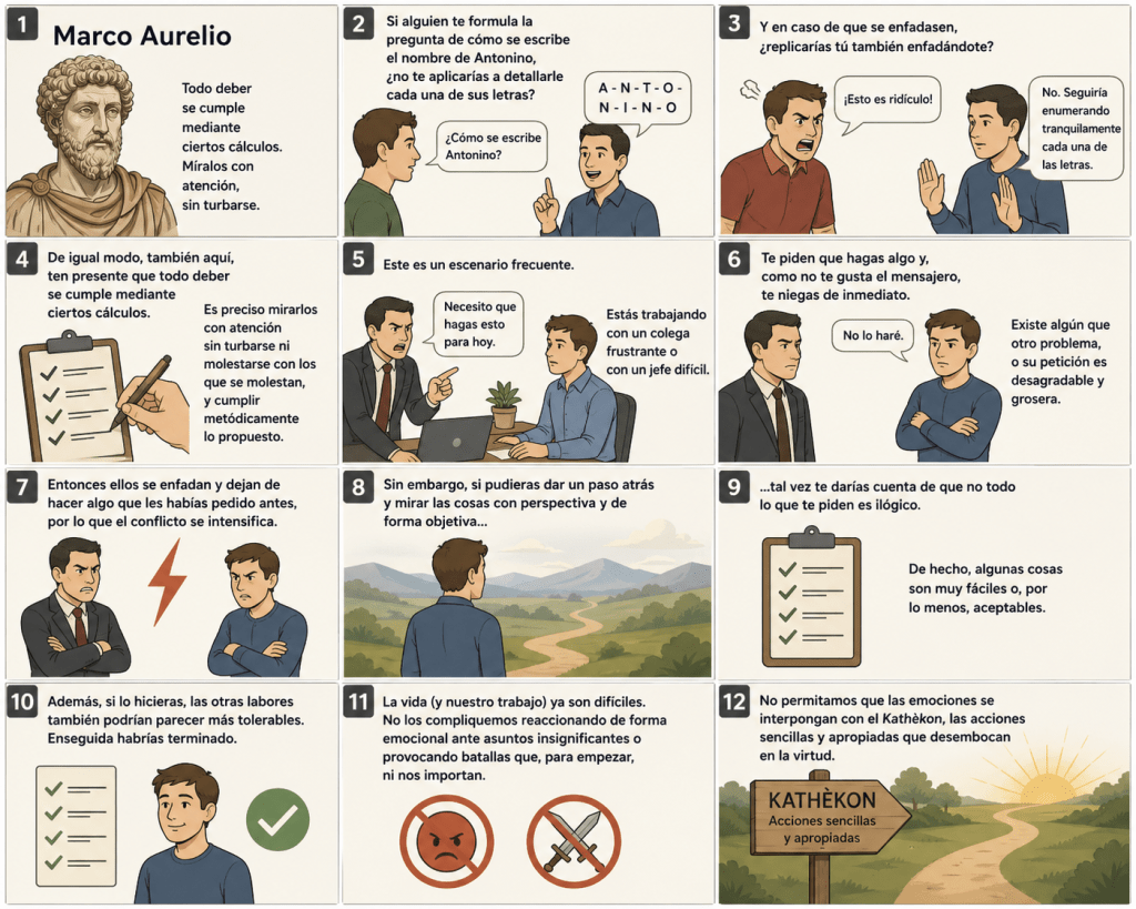 La vida (y nuestro trabajo) ya son difíciles. No los compliquemos reaccionando de forma emocional ante asuntos insignificantes o provocando batallas que, para empezar, ni nos importan. No permitamos que las emociones se interpongan con el Kathèkon, las acciones sencillas y apropiadas que desembocan en la virtud.